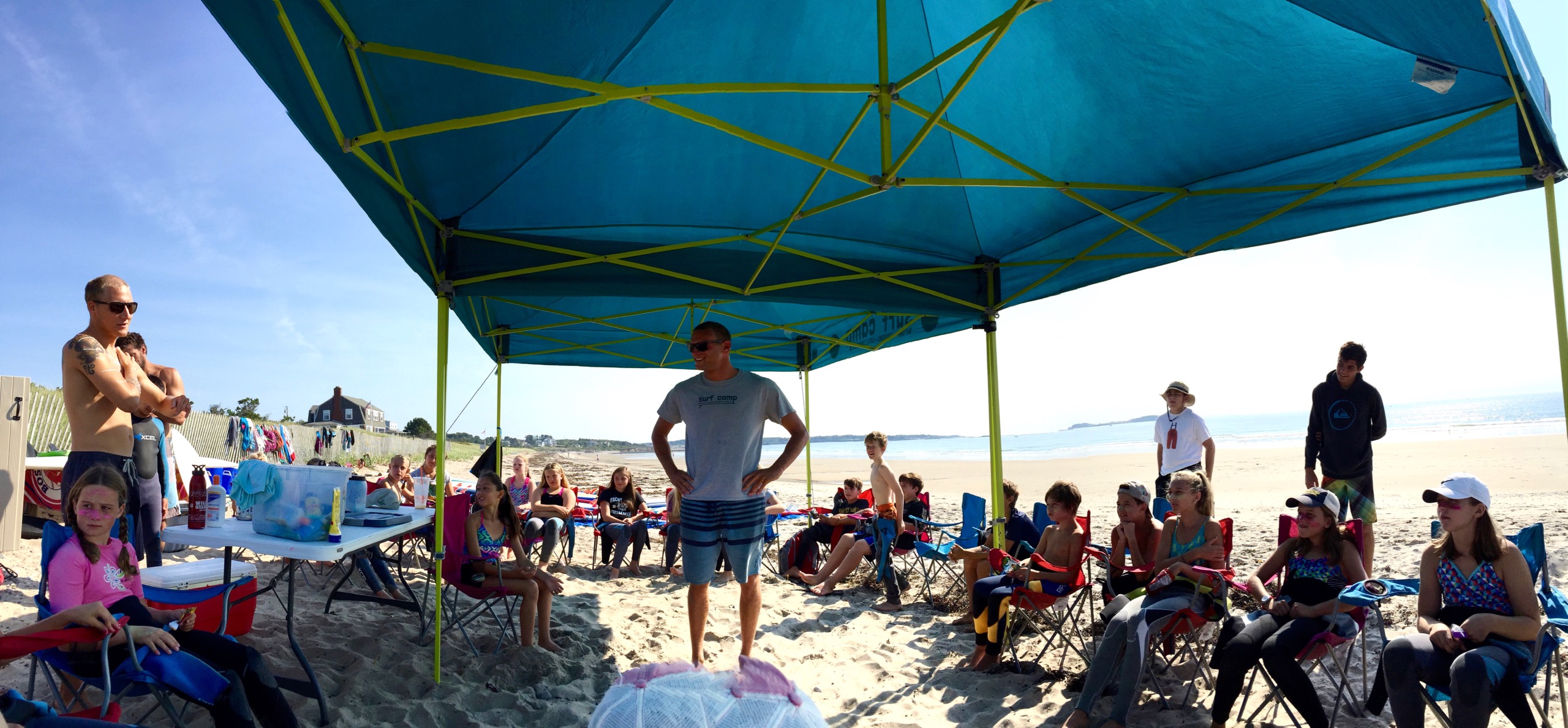 Campers arrive at Scarborough Beach State Park at 9AM. After getting a wetsuit and surfboard from our gear trailer, we head down to our camp at the beach. This camp is where we will spend the rest of the day. Our tents provide shelter from the weather and give the campers a place to hang out when they aren’t in the water. We also have snacks, water coolers, and gear boxes at our beach camp.